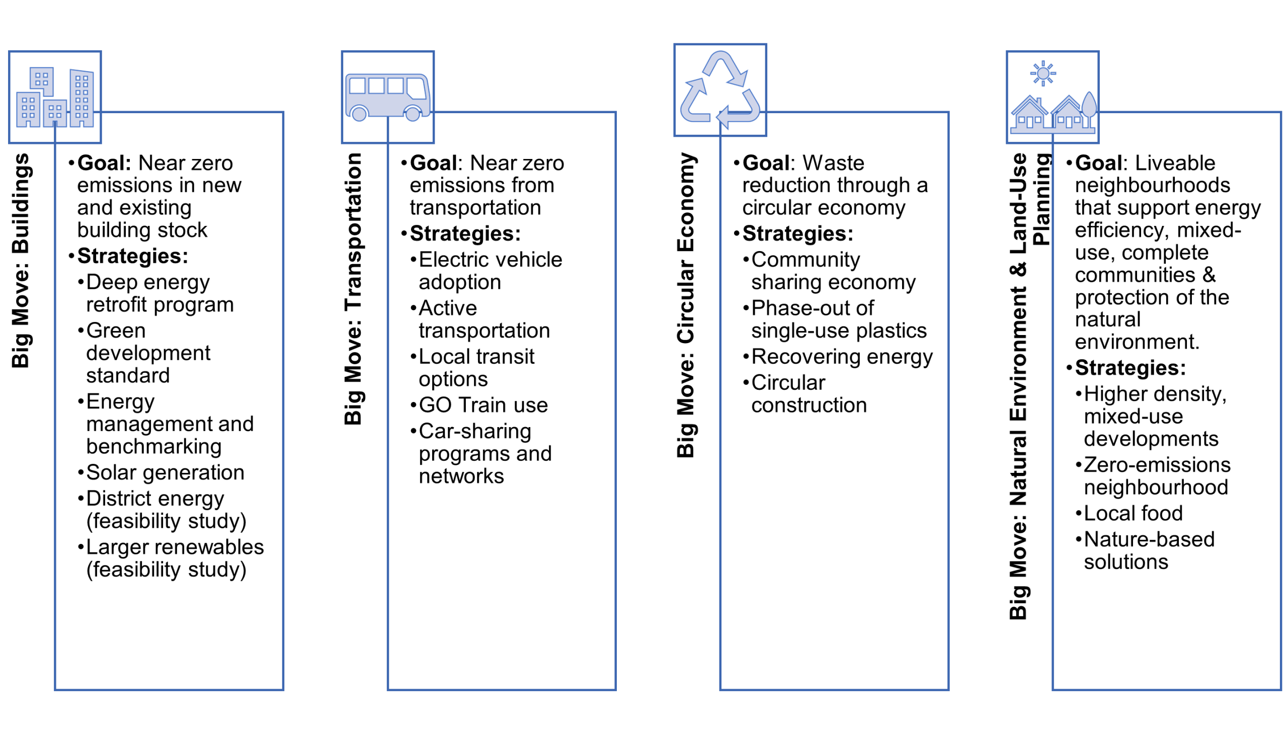 Our plan outlines four 'Big Moves' - buildings, transportation, circular economy, natural environment and land use. Each Big Move includes a goal and supporting strategies, as outlined below.