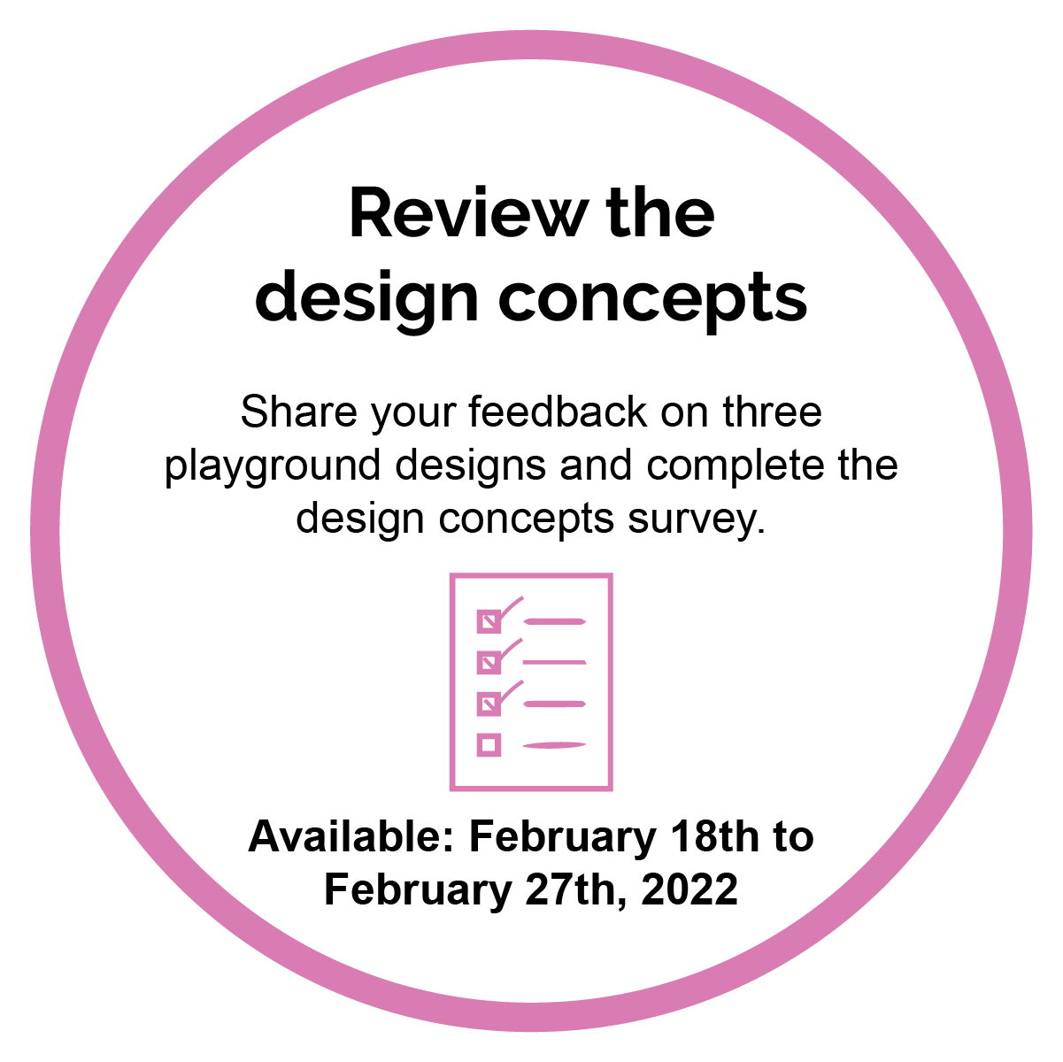![]() | Review the design concepts and submit your thoughts (COMPLETED) Three playground design concepts were presented to the public via Zoom at a Public Information Centre (PIC) held on Thursday February 17th, 2022. Residents were invited to participate in Survey #2 - Design Concepts Feedback to provide feedback on the preliminary design concepts until Sunday February 27, 2022. The collected feedback will be used to inform the creation of a final preferred design concept. |