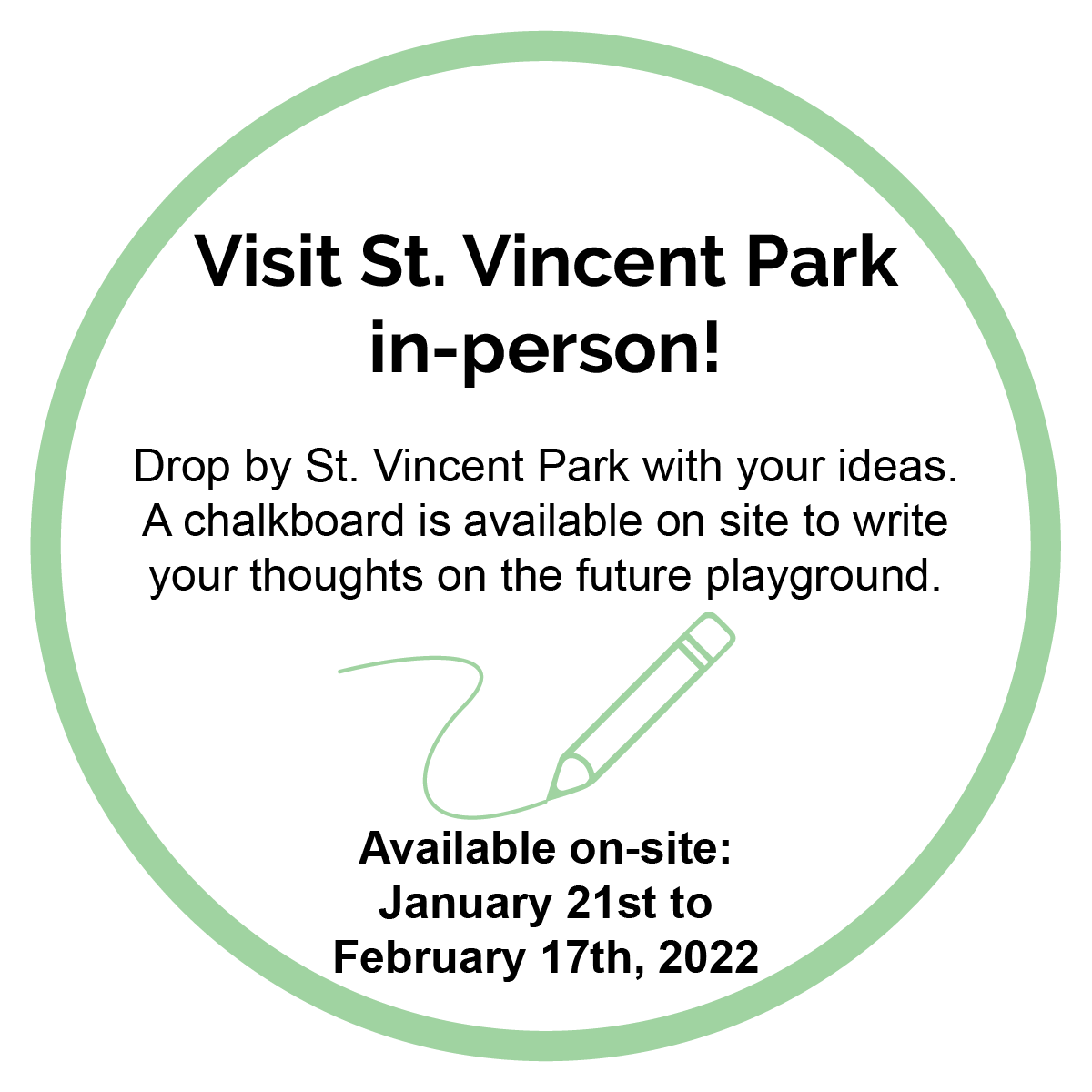 ![]() | Share your ideas with us at the Park (COMPLETED) Visit St. Vincent Park and get inspired! Project information boards were available on-site, as well as an open chalkboard, for you to share your St. Vincent Park playground vision with us. Click here to view the chalkboard contributions. |