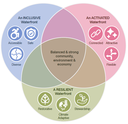 - Inclusive: the waterfront should be a place that is accessible, safe and comfortable for all to enjoy—regardless of race, culture, ability, sexual orientation, gender identity, or socio-economic status.